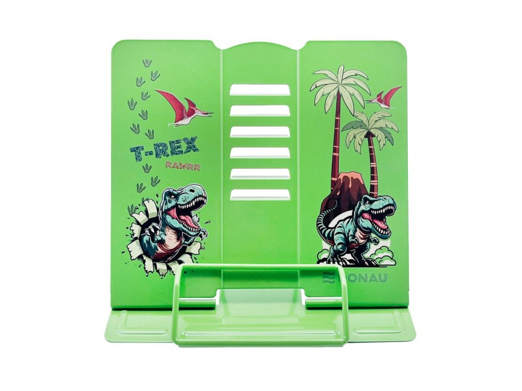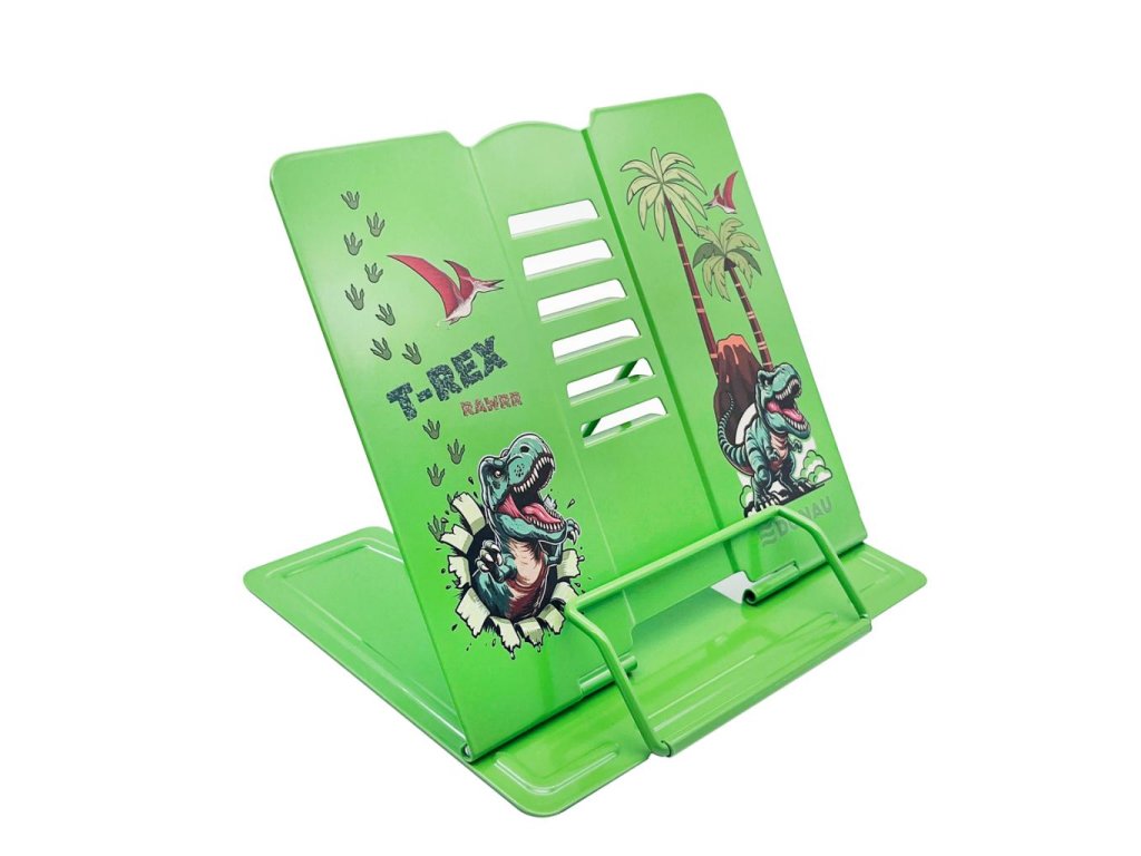 Kvalitný stojan na knihy, učebnice alebo tablet s atraktívnou potlačou Dino T-Rex. Vyrobený z odolného lakovaného kovu, ideálny aj pre ťažšie knihy. S protišmykovými úchytmi, nastaviteľná výška a uhol sklonu v 5 stupňoch. Keď sa nepoužíva, zloží sa úplne naplocho. Súčasťou je aj praktická zarážka na otvorenú stránku. Využitie nájde doma, v škole, v kuchyni, v kancelárii či ako stojan na noty. Rozmery: základňa: 21 × 16,5 cm, výška: 15,7 cm.Dodatočné parametre