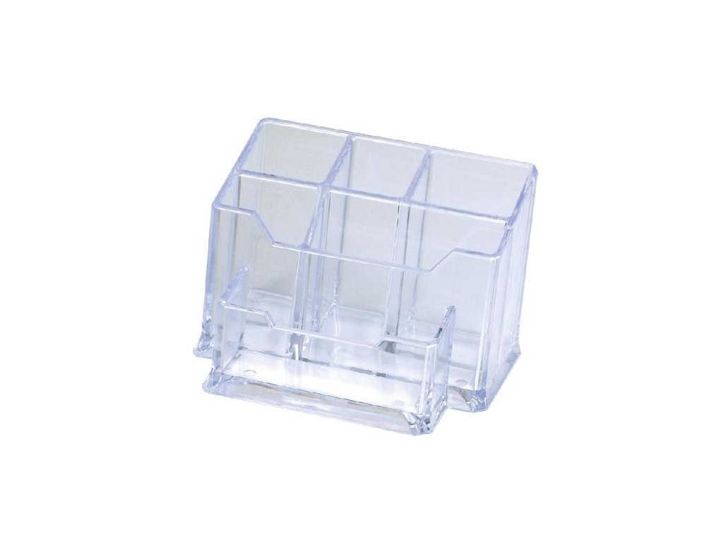 Priehľadný šesťdielny stojan na písacie potreby z tvrdeného akrylového plastu odolného voči prasknutiu. Rozmery 147 × 100 × 100 mm.Farba: priehľadná číra