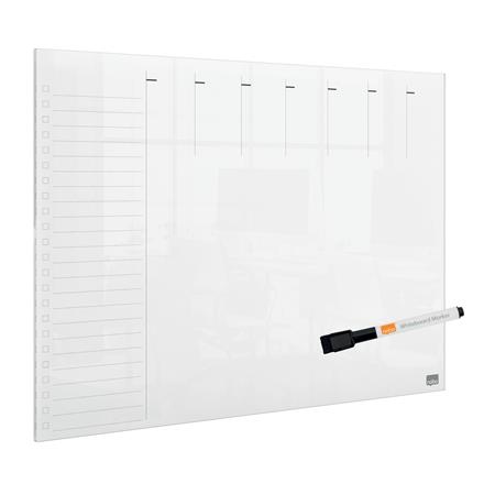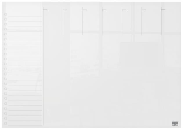 Tento týždenný plánovač do domácej kancelárie je vďaka svojmu modernému bezrámovému dizajnu a týždennej mriežke ideálny na zapisovanie poznámok, myšlienok, nápadov a dôležitých dátumov. Vďaka samolepiacim podložkám a magnetom ho možno použiť ako nástennú tabuľu, keď sa pripevní na kovový povrch, alebo ako tabuľu, keď sa položí na stôl alebo inú pracovnú plochu. Vďaka priehľadnému dizajnu pripomienková tabuľa splynie s okolím, keď sa nepoužíva. Jej povrch so suchou gumou sa ľahko udržiava v čistote, stačí na ňu písať, utrieť ju a začať znova. Súčasťou balenia je: 1 pero na bielu tabuľu. Veľkosť: A3.