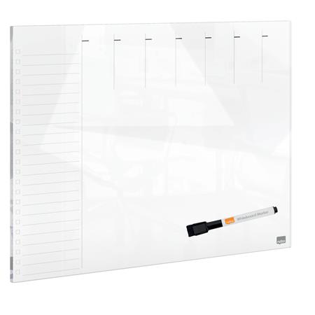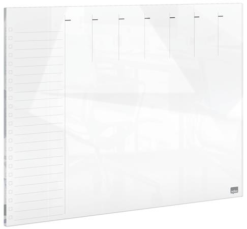 Sklenená plánovacia tabuľa na plánovanie úloh doma alebo v práci. Povrch je ideálny na zaznamenávanie pripomienok, schôdzok a zoznamov. Sklenený materiál prémiovej kvality odoláva atramentovým škvrnám, stopám od pera a škrabancom; stačí naň napísať a zmazať. - dá sa nasucho stierať - sklenená, magnetická tabuľa - štýlový, bezrámový dizajn - týždenné rozdelenie - protišmykové podložky udržia tabuľu na mieste na každej pracovnej ploche - rozmer: 430x560 mm - príslušenstvo: 1x popisovač na tabule - záruka 25 rokov na povrch