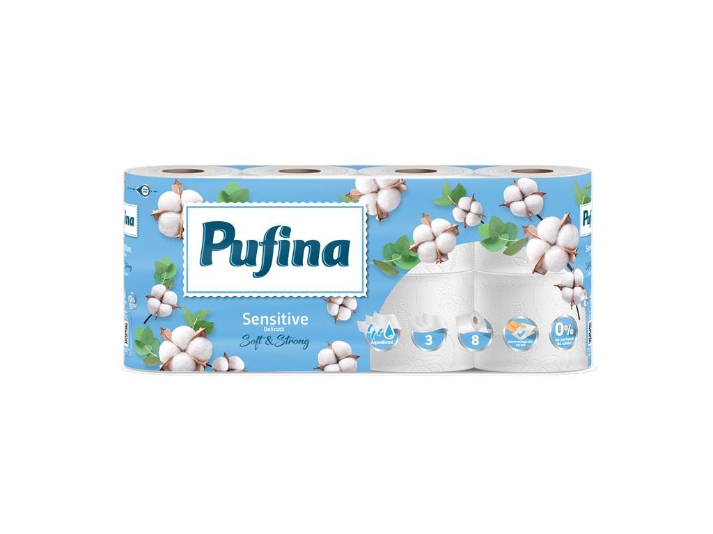 Toaletný papier, 3 vrstvový, malá rolka, 8 roliek, PUFINA "Sensitive Aquabond", bez vône