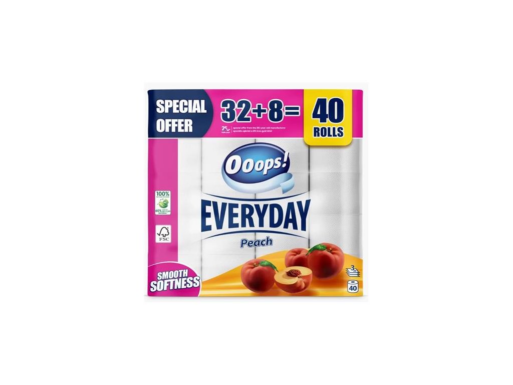 trojvrstvový toaletný papier -115 listov/kotúč-vôňa broskyne -biely -40 kotúčov/bal -väčšie balenia: 48 bal/kartónZnačka: OOOPS