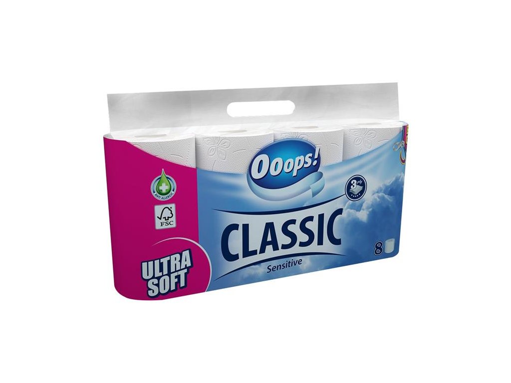 Toaletný papier, 3-vrstvový, malý kotúč, 8 kotúčov, OOOPS "Classic", sensitive
