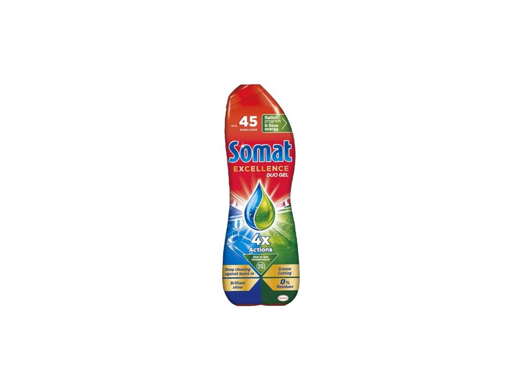 Somat Excellence Duo Gél vďaka jedinečnej dvojkomorovej fľaši kombinuje dve účinné zloženia na silný účinok proti tuku a odstránenie pripálených nečistôt. Efektívne čistí a zabezpečuje žiarivo čistý riad aj pri nízkych teplotách a krátkych umývacích programoch.