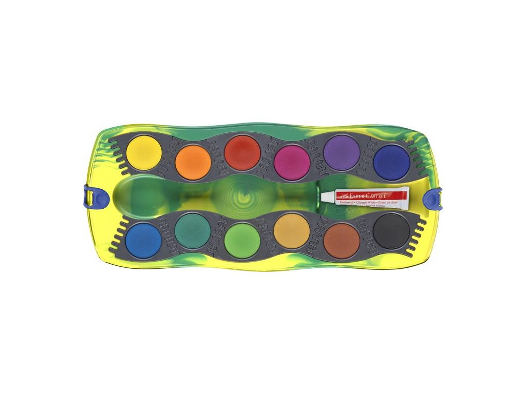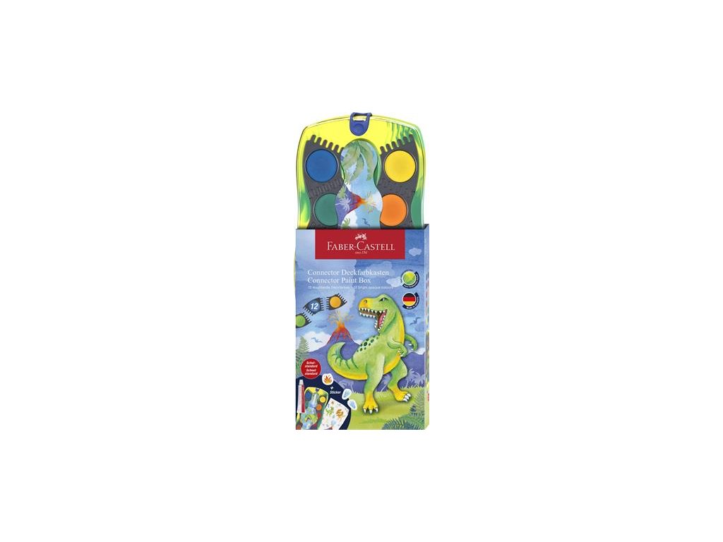 Vodové farby, 12-kusové, skladacie, FABER-CASTELL "Dinosaurus" + 1 tuba bielej temperovej farby + nálepky dinosaura