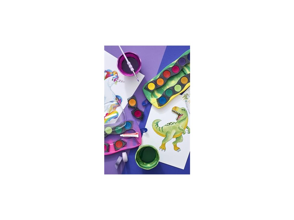 Obsah balenia: 12 rôznych farieb vodových farieb, 1 tuba bielej temperovej farby + nálepky dinosaura.