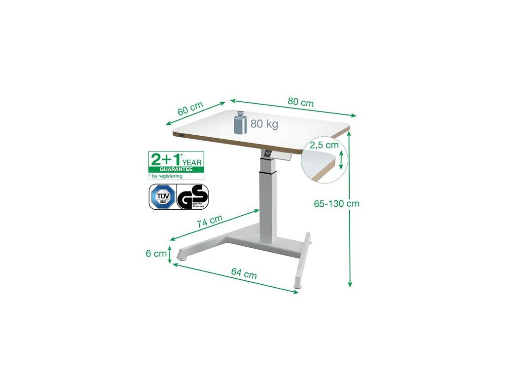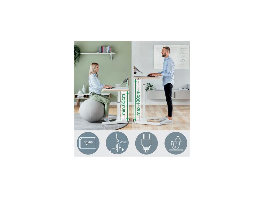 Elektrické nastavenie výšky v rozmedzí 65–130 cm pre všetky vaše potreby, motor na plynulé a tiché (<25 dB) nastavovanie, ochrana proti prehriatiu a funkcia proti kolízii