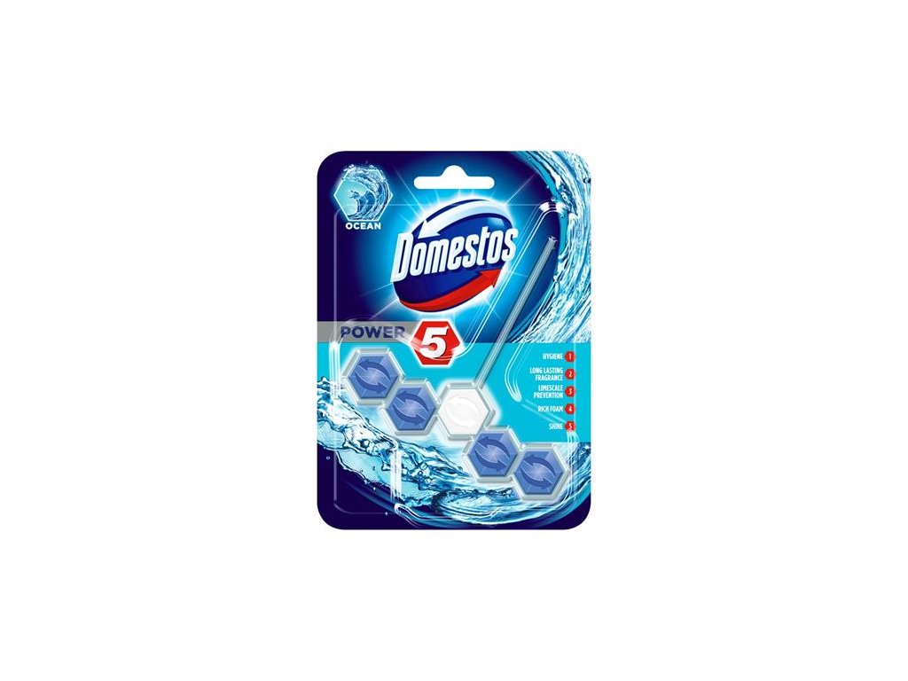 Domestos Power5 WC osviežujúci blok pomáha predchádzať špine a usadzovaniu vodného kameňa aj medzi čisteniami. Po každom spláchnutí zanechá bohatú penu, ktorá pomáha zabrániť usadzovaniu vodného kameňa, odstrániť špinu a zanechať WC misu žiarivú, s dlhotrvajúcou príjemnou vôňou.