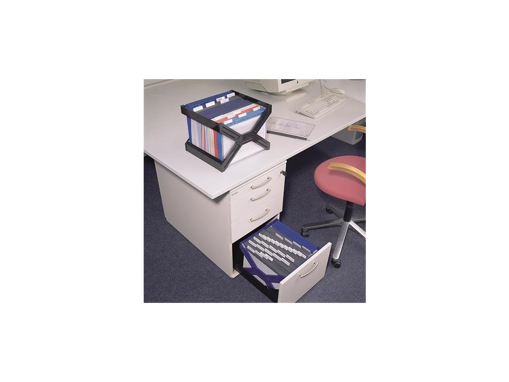 Zásobník na závesné obaly s kapacitou 30 závesných obalov formátu A4. Vhodný na stôl alebo do police. Rám vyrobený z tvrdeného plastu s možnosťou stohovania niekoľkých zásobníkov nad sebou. Farba: modrá Rozmery: 360 x 270 x 320 mm Šírka zavesenia: 330 mmDodatočné parametre
