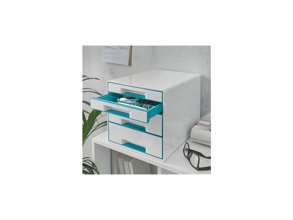 Zásuvkový box na dokumenty, plastový, 4 zásuvky, LEITZ "Wow Cube, biela/ľadovo modrá