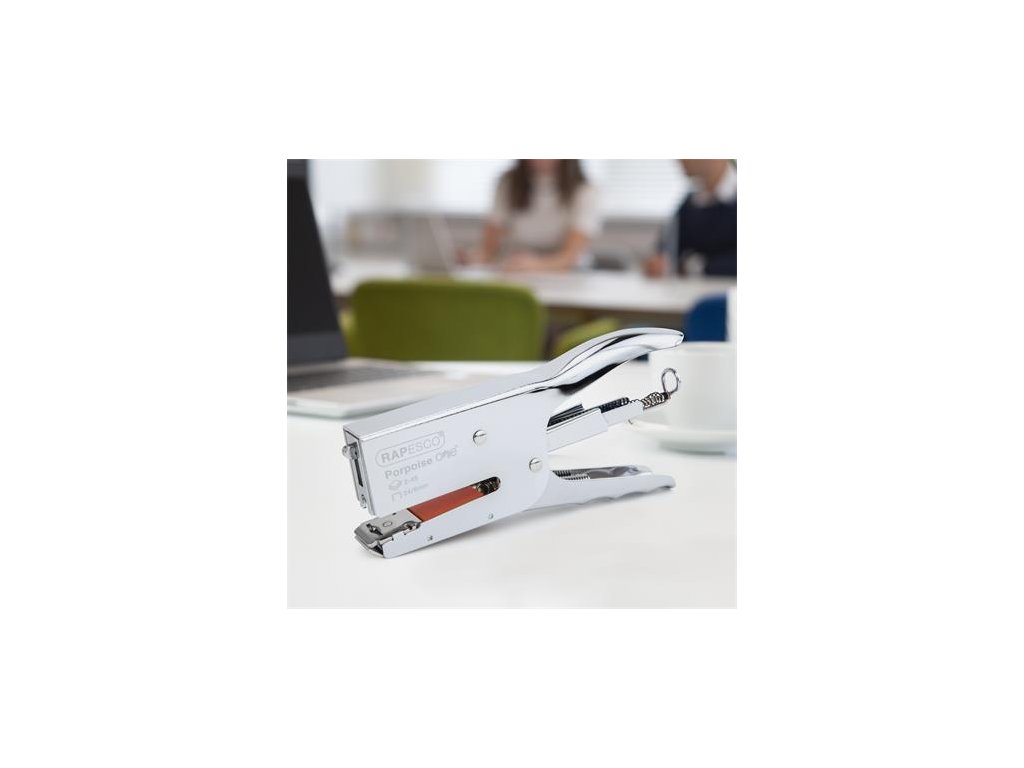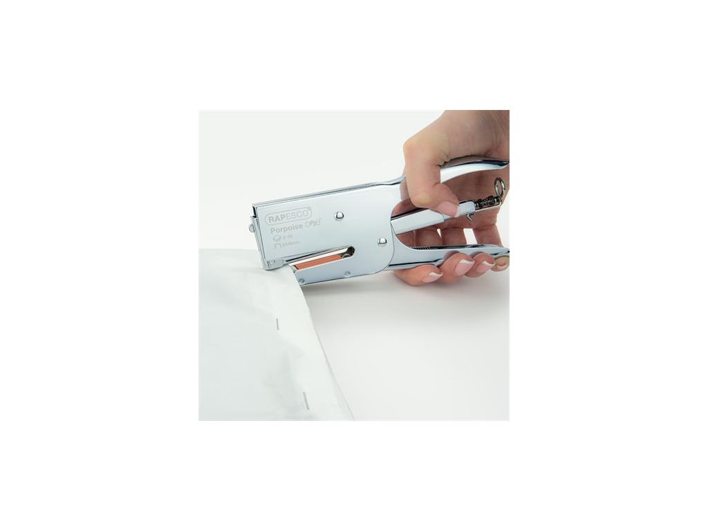 Zošívačka Rapesco Porpoise ONE – ideálna na rýchle zošívanie aj balenie. -vhodná na použitie na poštách, v gastronómii, skladoch a ďalších prevádzkach -ručná zošívačka -odolné kovové telo a vnútorná konštrukcia -plnenie zozadu – dopĺňanie stlačením alebo vyklopením zadnej pružiny -kapacita: 2–45 listov (80 g/m²) -kompatibilné so spinkami 24/8 mm -darček: 1000 ks spiniek Rapesco 24/8 mm -ergonomický dizajn -rozmery: 175 x 22 x 92 mm
