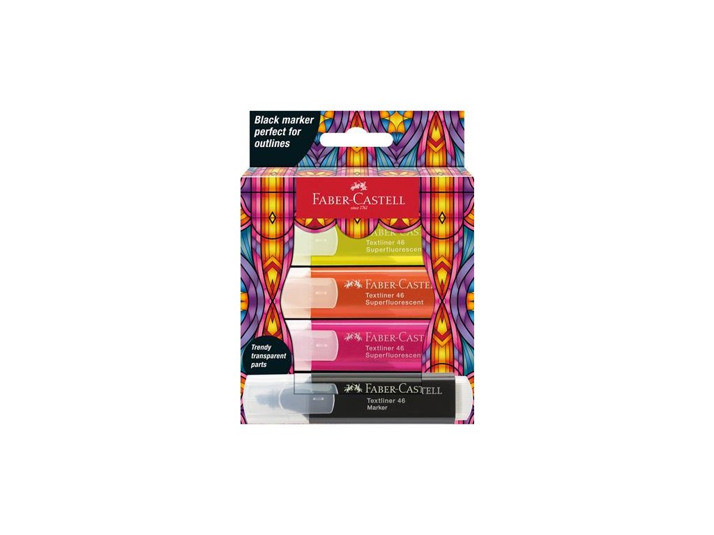 Zvýrazňovač, sada, FABER-CASTELL "Glassy", 3 rôzne neónové farby + čierna